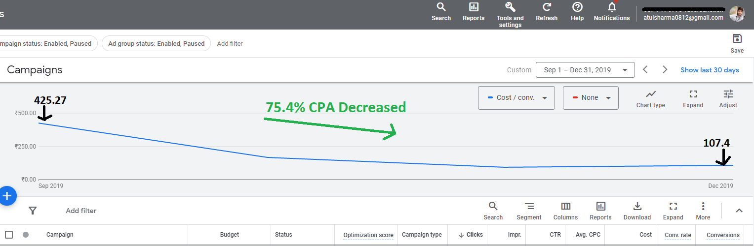 The client was running a PPC campaign to generate online leads for their business. But, the account cost per Lead (CPA, CPL) was way high, hence the client was burning all their profits in running the ads. Her main concern was to reduce the budget spend without compromising the number of leads.